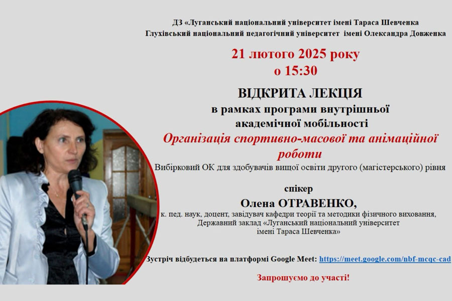 21 лютого відбулася відкрита гостьова лекція «Організація спортивно-масової та анімаційної роботи» (вибірковий освітній компонент) в рамках програми внутрішньої академічної мобільності для здобувачів другого (магістерського) рівня, спікер: к.п.н., доцент, завідувач кафедри теорії та методики фізичного виховання Олена ОТРАВЕНКО.