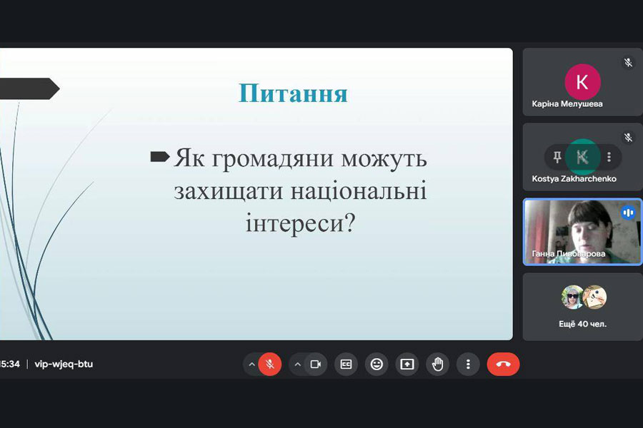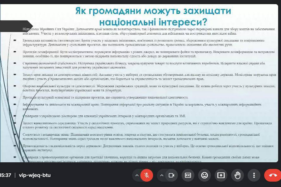 У другій половині заходу відбулася жвава дискусія на тему “Як кожен громадянин може захищати національні інтереси”. Студенти обговорювали практичні аспекти проявів патріотизму та захисту держави у мирному житті. Було розглянуто питання щодо підтримки Збройних Сил України та боротьби з ворожою пропагандою.
