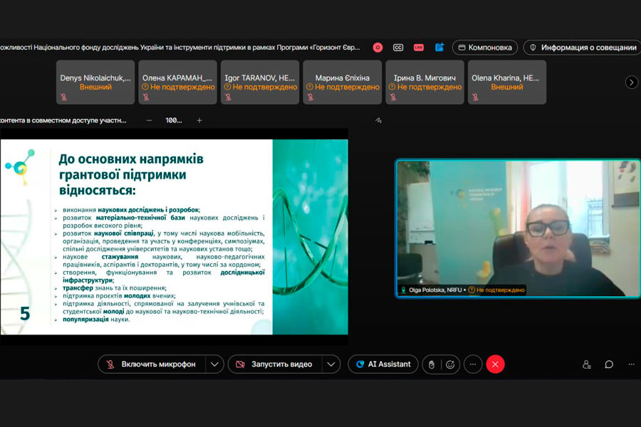 Під час робочої частини інформаційної сесії фахівці НФДУ представили основні інструменти фінансування для науковців та можливості участі українських установ у програмах Європейського Союзу. Пані Ольга Полоцька у своїй презентації висвітлила види грантової підтримки – індивідуальні, колективні та інституційні гранти – а також основні напрями підтримки: виконання наукових досліджень і розробок, розвиток матеріально-технічної бази, наукова співпраця й мобільність, стажування науковців, створення та розвиток дослідницької інфраструктури, підтримка молодих учених і популяризація науки. Також було представлено переваги роботи НФДУ: конкурсний відбір проєктів, прозорі механізми фінансування, відповідність грантів реальним потребам дослідників та можливість залучення альтернативних джерел фінансування.