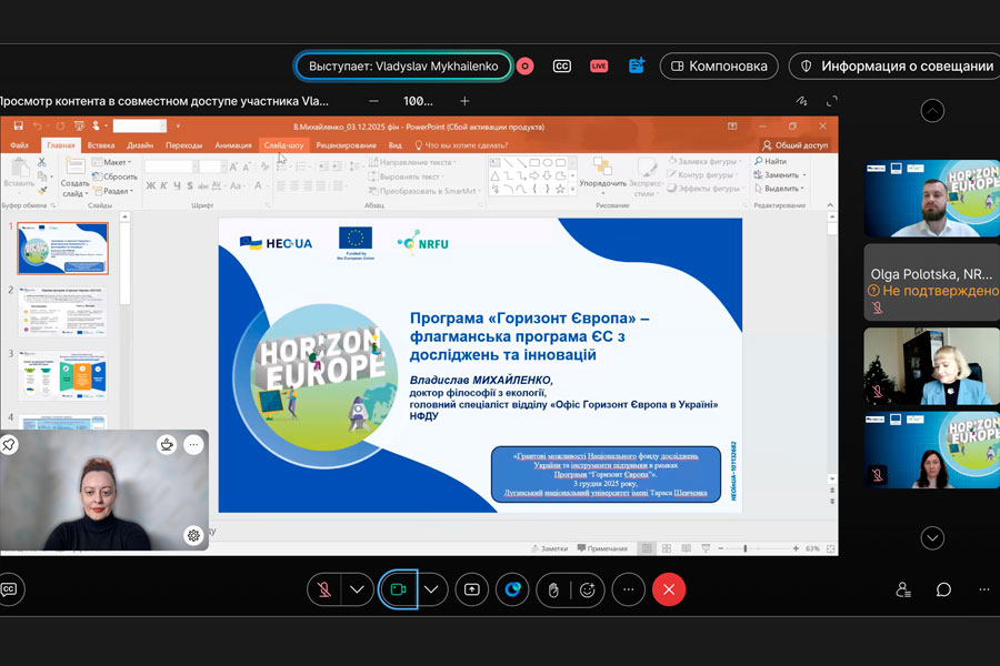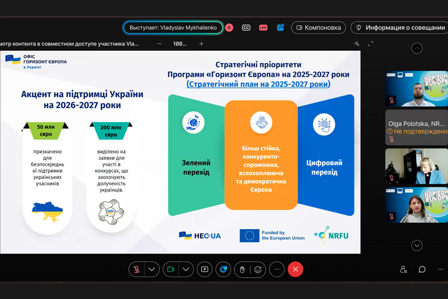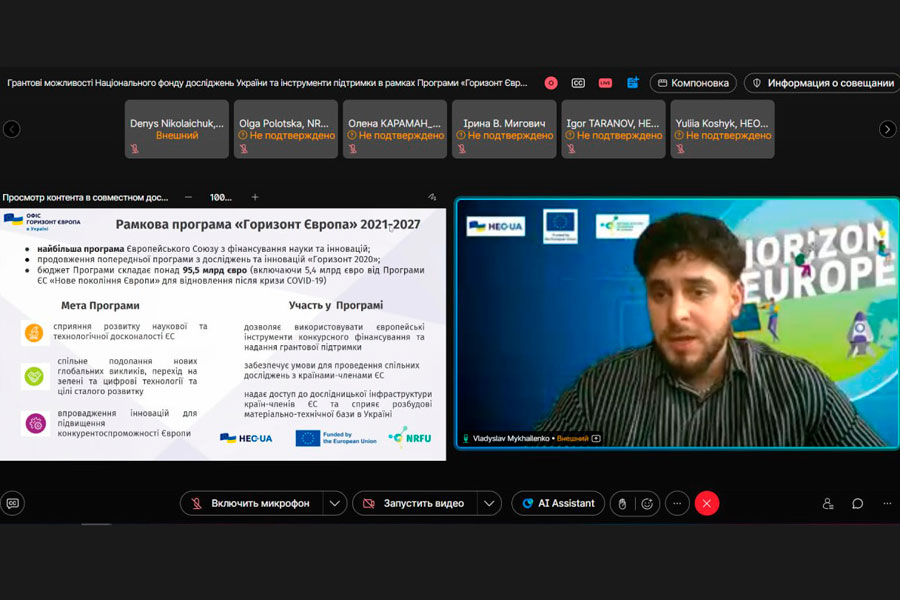 Пан Владислав Михайленко, головний спеціаліст «Офісу Горизонт Європа в Україні», представив основні можливості найбільшої дослідницької програми ЄС з бюджетом понад 95,5 млрд євро. Він розглянув ключові цілі програми: розвиток наукової та технологічної досконалості, подолання глобальних викликів, зміцнення інноваційності й конкурентоспроможності Європи. Також були представлені можливості участі українських дослідників у спільних проєктах із країнами-членами ЄС і доступ до дослідницької інфраструктури та грантових інструментів Європейської комісії.