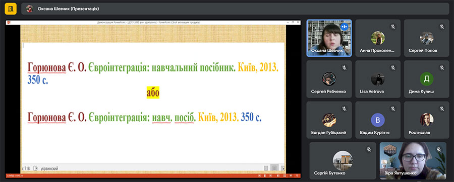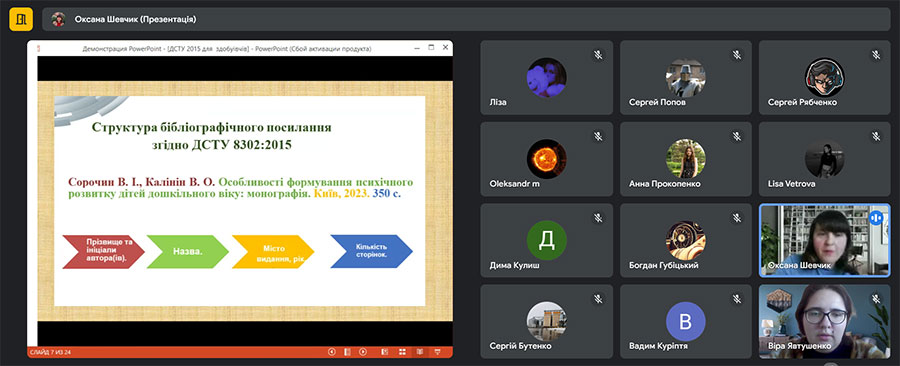 Особливу увагу звернули на оформлення списку використаних джерел, як на важливий елемент у структурі кваліфікаційної роботи. Оксана Володимирівна ознайомила здобувачів освіти з Національним стандартом України ДСТУ 8302:2015, інформацією та документацією, бібліографічними посиланнями, загальними положеннями та правилами складання. Увагу звернули і на переваги цього документу: відповідність міжнародним стандартам, тенденцію до спрощення, рекомендації МОН України. Також Оксана ШЕВЧИК розповіла про сервіси «Grafiati» та ONTU4Ref, за допомогою яких можна оформити посилання для наукових і дипломних робіт, дисертацій і т. ін. онлайн.