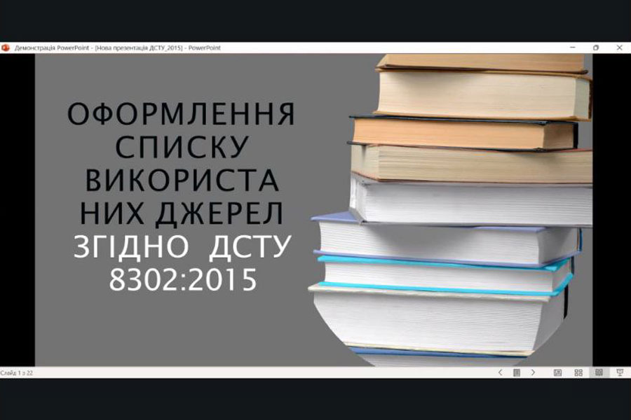 У межах цієї діяльності 16 жовтня відбувся інформаційно-ознайомчий вебінар для здобувачів освіти кафедри соціальної педагогіки Навчально-наукового інституту педагогіки та психології. Темою зустрічі стало «Оформлення бібліографічних посилань у списку використаних джерел відповідно до стандарту ДСТУ 8302:2015».