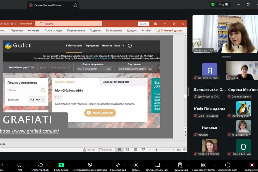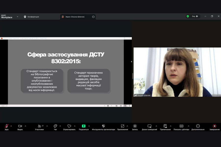 Під час вебінару обговорювалися основні вимоги до правильного оформлення результатів наукових досліджень, правила цитування та складання бібліографічних посилань. Учасники дізналися про особливості роботи з різними видами джерел, використання розділових знаків і принципи структурування списку літератури.