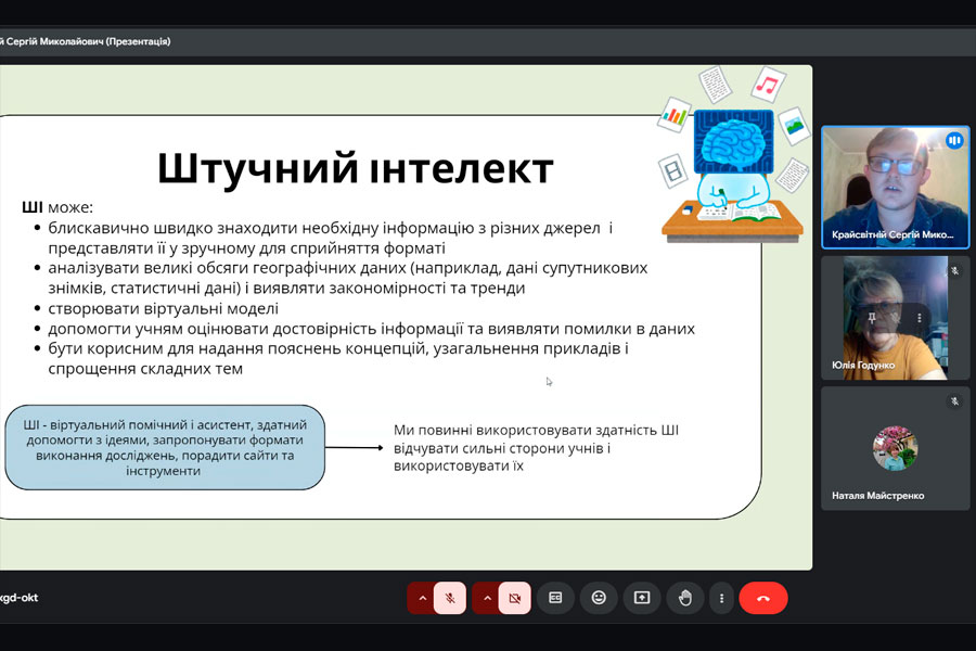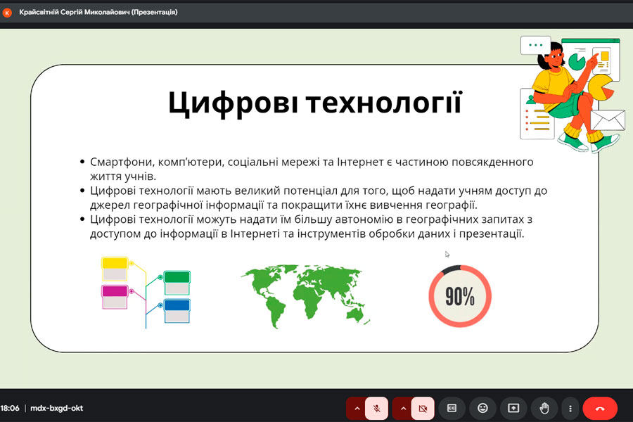 Випускник магістратури 2025 р. за спеціальністю «Середня освіта (Географія)» Сергій КРАЙСВІТНІЙ презентував доповідь на тему «Використання сучасних технологій у дослідницькій діяльності учнів». Доповідач зазначив, що сучасні технології відкривають нові горизонти для вивчення географії. Вони перетворюють уроки на захоплюючі «дослідницькі експедиції». Учні та учениці стають активними учасниками навчального процесу, використовуючи інноваційні інструменти для вивчення нашої планети.