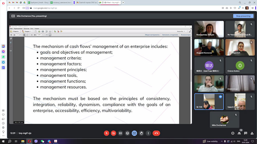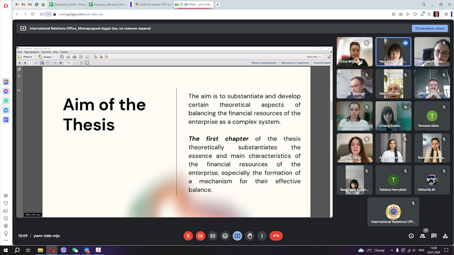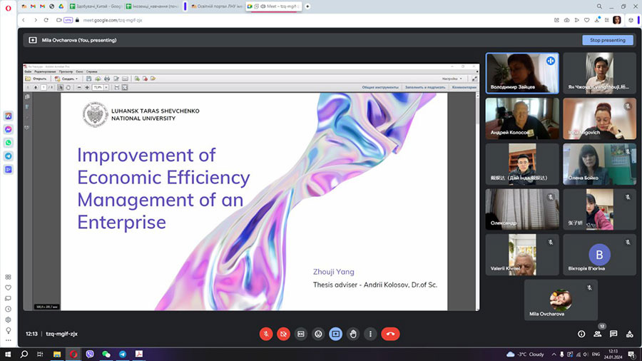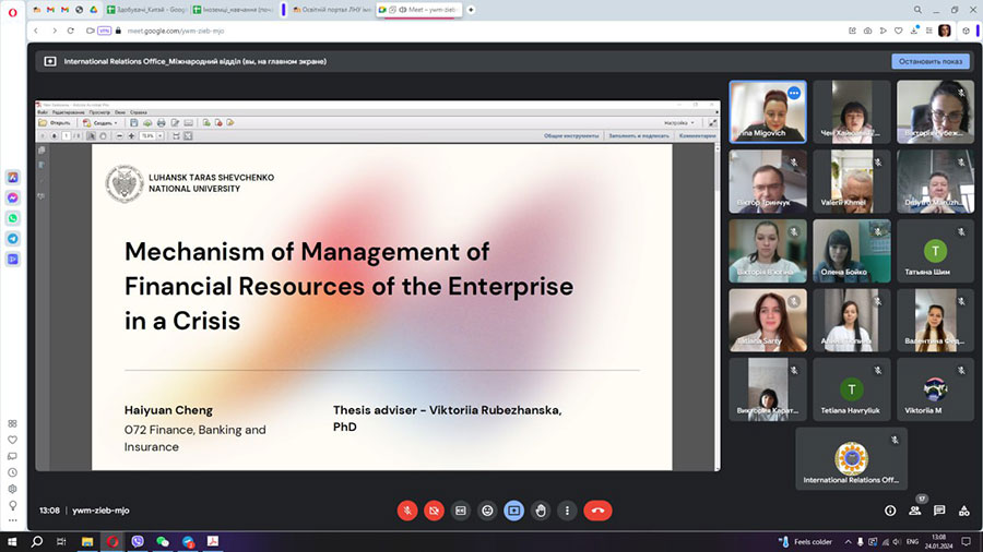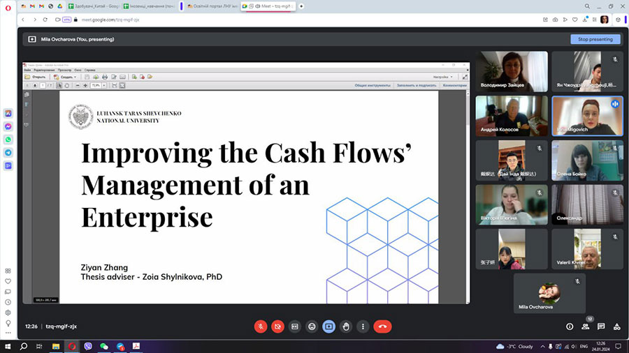 01.2024:1) Чен Хайюань – магістрантка освітньої програми Фінанси, банківська справа та страхування спеціальності 072 Фінанси, банківська справа та страхування. Тема магістерського дослідження «Механізм управління фінансовими ресурсами підприємства в умовах кризи» (науковий керівник – кандидат економічних наук, старший викладач кафедри фінансів, обліку та банківської справи Вікторія РУБЕЖАНСЬКА); 2) Дай Їнда – магістрант освітньої програми Менеджмент організацій і адміністрування спеціальності 073 Менеджмент. Тема магістерського дослідження «Управління інноваційною діяльністю підприємства» (науковий керівник – кандидат економічних наук, доцент кафедри менеджменту Зоя ШИЛЬНІКОВА); 3) Чжан Цзіян – магістрантка освітньої програми Менеджмент організацій і адміністрування спеціальності 073 Менеджмент. Тема магістерського дослідження «Удосконалення управління грошовими потоками підприємства» (науковий керівник – кандидат економічних наук, доцент кафедри менеджменту Зоя ШИЛЬНІКОВА); 4) Ян Чжоудзі – магістрант освітньої програми Менеджмент організацій і адміністрування спеціальності 073 Менеджмент. Тема магістерського дослідження «Удосконалення управління економічною ефективністю діяльності підприємства» (науковий керівник – доктор економічних наук, професор кафедри менеджменту Андрій КОЛОСОВ);
