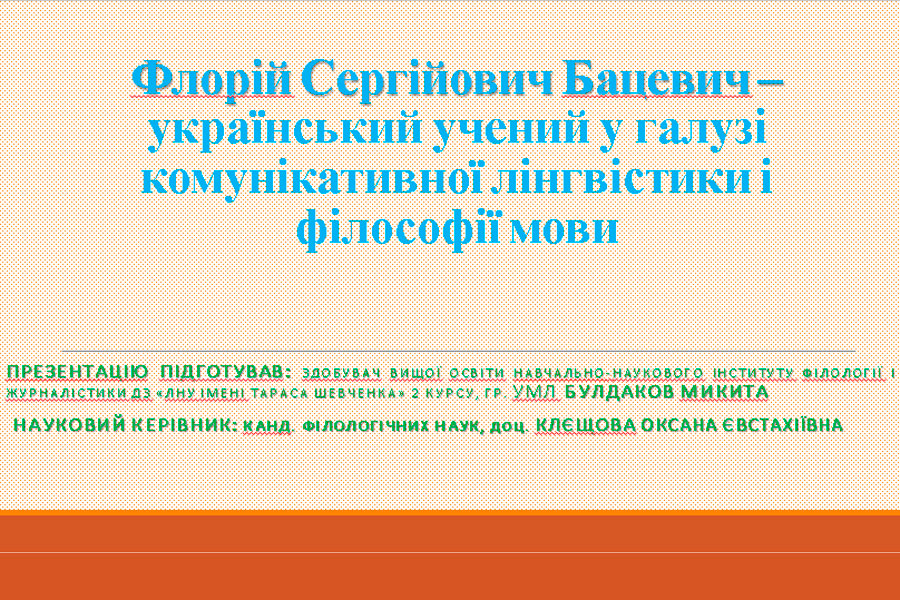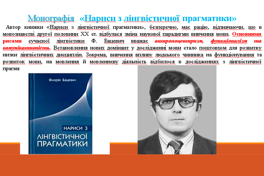 Здобувач освіти 2 курсу ОП «Середня освіта (Українська мова і література)» Булдаков Микита підготував презентацію про львівського вченого у галузі комунікативної лінгвістики і філософії мови – Флорія Сергійовича Бацевича – професора, доктора філологічних наук, завідувача кафедри загального мовознавства Львівського національного університету імені Івана Франка, заслуженого професора Львівського університету. Флорій Бацевич – комунікативіст не тільки за напрямом філологічних розробок, але і за сутністю наукової роботи, що звернена до активного сприйняття слова, визначення наукової позиції, діалогу. Дослідницький інструментарій Ф. Бацевича точний як у вимірах глибинних спостережень й однозначності операційних термінів, так і широти культурного поля, у якому розгортаються мовознавчі колізії авторських інтерпретацій дослідницьких текстів. Основними рисами сучасної лінгвістики Ф. Бацевич вважає антропоцентризм, функціоналізм та комунікативність.