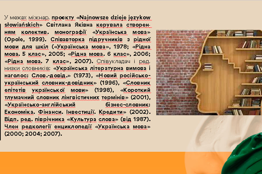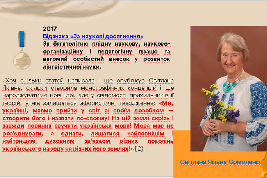 Здобувачка освіти 4 курсу ОП «Середня освіта (Українська мова і література)» Кучеренко Наталія підготувала презентацію про академіка Національної академії наук України Світлану Яківну Єрмоленко, доктора філологічних наук, професора, багаторічну завідувачку відділу стилістики, культури мови та соціолінгвістики. Світлана Яківна – відомий учений у галузі української лінгвостилістики, стилістики слов’янських мов, синтаксису, теорії літературної мови, яка заклала теоретичні основи лінгвофольклористики, напрями сучасних студій із культури мови, обґрунтувала концептуальний зміст понять «рідна мова», «літературна мова», «часова і просторова глибина мовної норми», «мовно-естетичні знаки національної культури». Сформулювала ідею системної природи стилістичного значення синтаксичних одиниць, структурно-семантичного варіювання простих і складних речень у різновидах мови.
