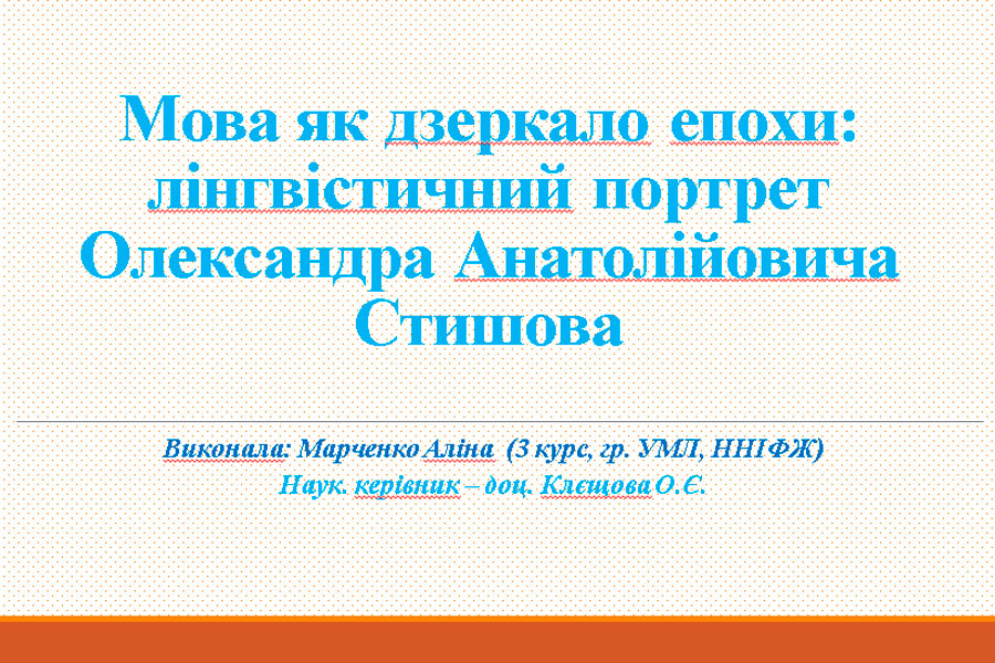Здобувачка освіти 3 курсу ОП «Середня освіта (Українська мова і література)» Марченко Аліна у своїй презентації «Мова як дзеркало епохи: лінгвістичний портрет Олександра Анатолійовича Стишова» розповіла про дослідження професора, які демонструють мову як поле постійної динамічної взаємодії протилежних тенденцій (окнижнення та орозмовлення, прагнення до економії та експресивності, глобалізації та автохтонізації). Олександр Стишов – це не просто лінгвіст-теоретик, а й уважний спостерігач, літописець мовної сучасності. Його праці є обов’язковими для кожного, хто хоче зрозуміти, як і чим живе українська мова сьогодні. Вони надихають на подальші дослідження та доводять, що вивчення мови – це нескінченно цікавий процес пізнання власного народу та епохи.