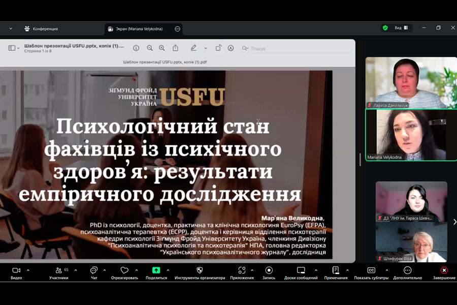 Мар’яна Великодна, кандидат психологічних наук, доцент кафедри психології Зіґмунд Фройд Університету «Україна», представила результати емпіричного дослідження у виступі «Психологічний стан фахівців із психічного здоров’я: результати емпіричного дослідження».
