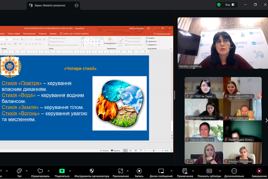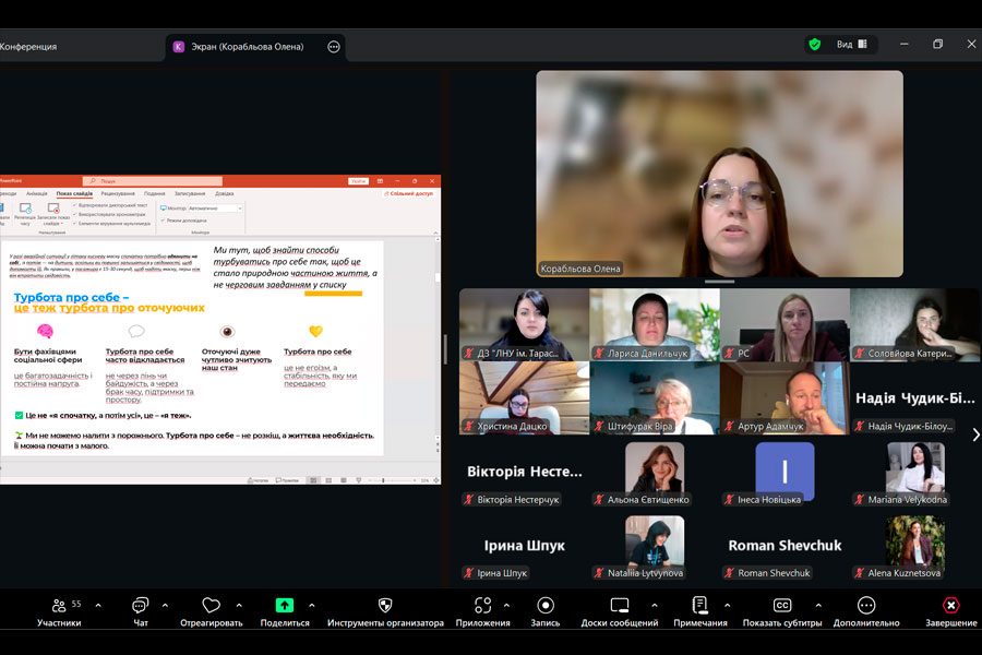 Наталія Литвинова, кандидат педагогічних наук, доцент кафедри соціальної педагогіки ДЗ «Луганський національний університет імені Тараса Шевченка», поділилася практичними порадами у виступі «Самодопомога та самовідновлення в умовах кризових ситуацій».