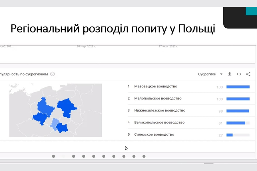 Наталія Внукова - професор кафедри банківської справи і фінансових послуг ХНЕУ ім. С. Кузнеця представила доповідь на тему «Оцінка рівня зацікавленості темою страхування в Україні та Польщі». Доповідачка акцентувала увагу присутніх на дуже загрозливій ситуації, що виникла на страховому ринку України. Підтвердженням цього є звіт НБУ щодо кількості страхових компаній, а саме – постійного звуження ринку. Загалом рівень зацікавленості фінансовим ринком є дуже низьким. Зокрема, зацікавленість темою страхування досягла найнижчої межі в середині березня 2022 року. Водночас, найбільш попит на страхові послуги відмічається в Тернопільській, Хмельницькій, Львівській областях та в м. Києві. Також існує великий попит на страхування в Польщі, який зумовлений великою кількістю українців, які переїхали до Польщі після початку війни. Як наслідок, є велика зацікавленість у страхових послугах українських провайдерів на території Польщі.