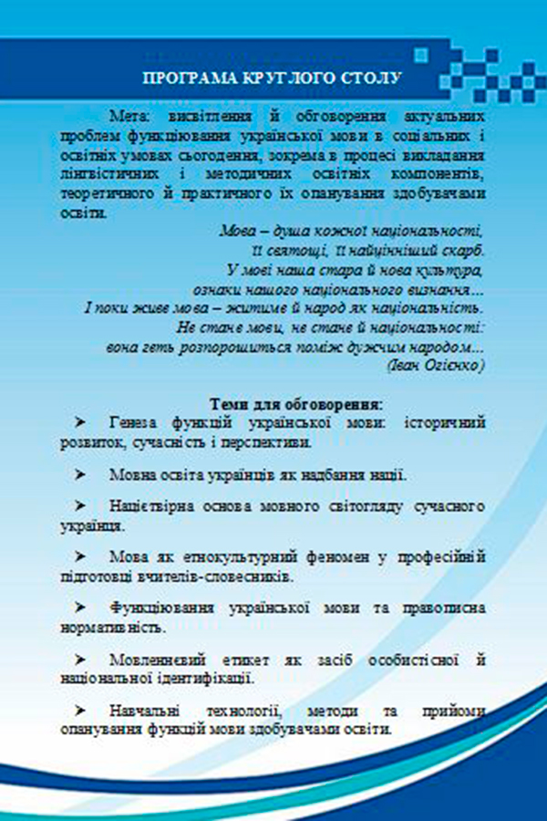 Мета проведення круглого столу передбачала висвітлення й обговорення актуальних проблем функціювання української мови в соціальних і освітніх умовах сьогодення, зокрема в процесі викладання лінгвістичних і методичних освітніх компонентів, теоретичного й практичного їх опанування здобувачами освіти.