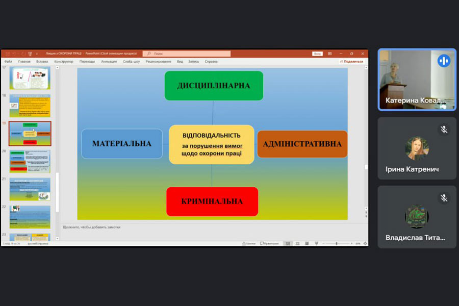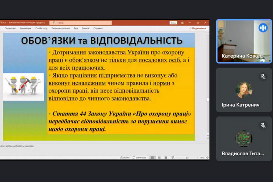 Під час лекції Ольга Йосипівна презентувала основні нормативно-правові акти, які регулюють сферу охорони праці в Україні. Особливу увагу було приділено актуальним вимогам законодавства та нормативам, що забезпечують безпеку працівників на робочих місцях. Лекторка детально розповіла про основні нюанси та важливі аспекти, які варто враховувати під час організації роботи у будь-якій сфері діяльності.