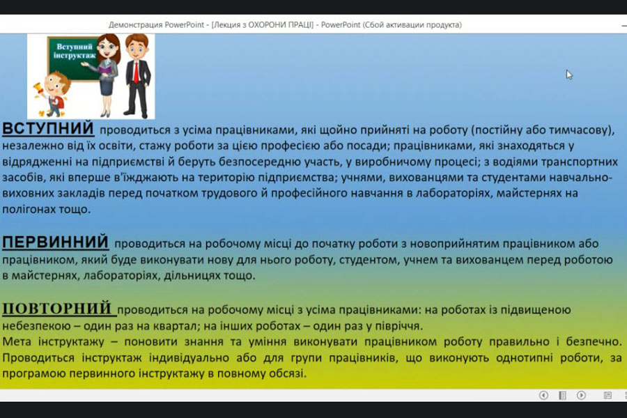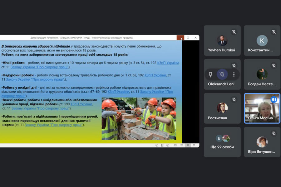 Мета лекції полягала у ознайомлені здобувачів освіти з основними нормативно-правовими актами, які регулюють сферу охорони праці в Україні. Ольга Йосипівна висвітлила актуальні вимоги законодавства та нормативи і наголосила на основних нюансах, які варто враховувати при організації роботи та освітньої діяльності.