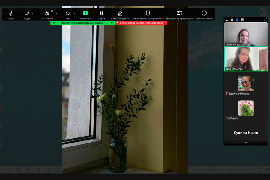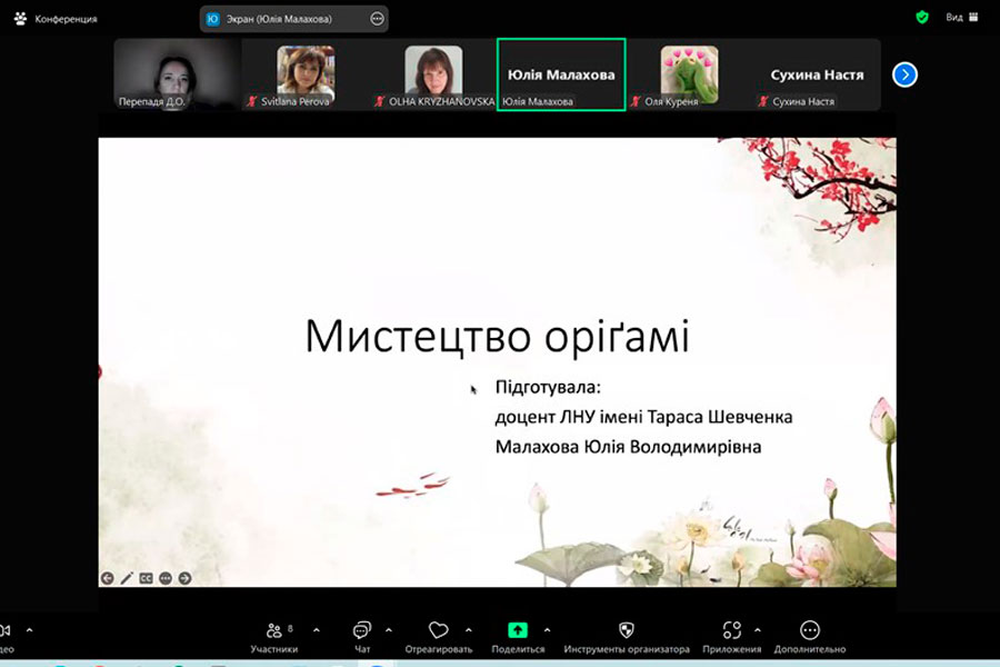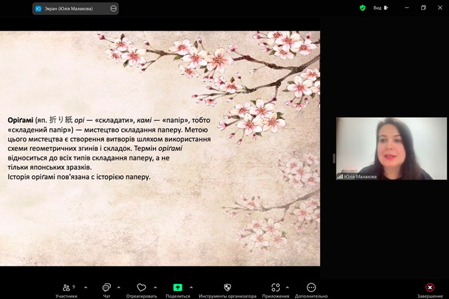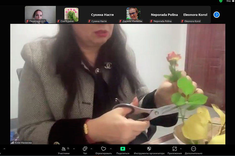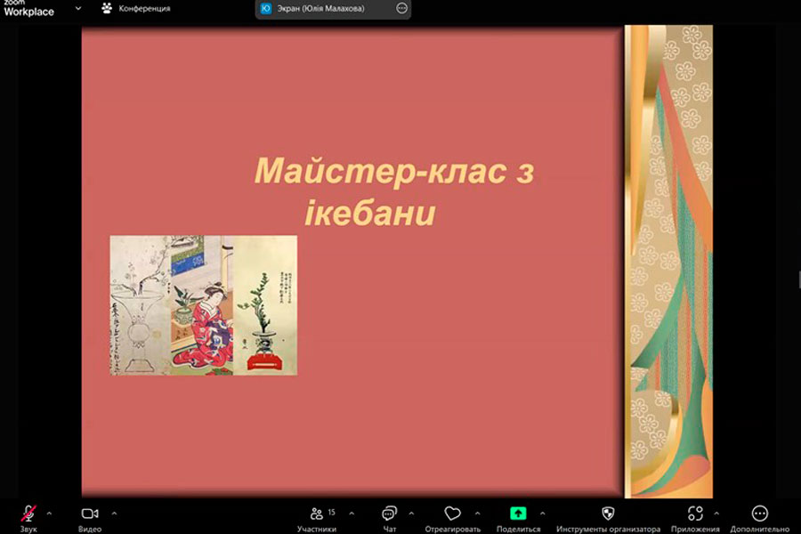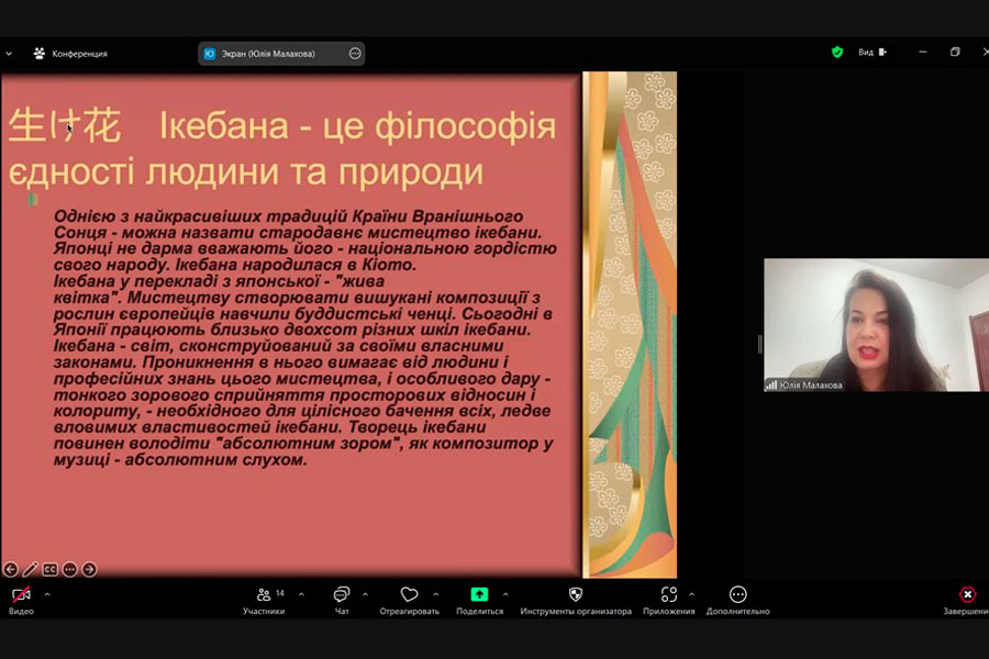 Юлія Малахова розпочала захід із яскравою презентацією й розповіла про історію створення цього давнього мистецтва та його особливості. Вона провела віртуальну екскурсію до виставки ікебани у Японії, розказала про техніки створення, продемонструвала інструменти, котрі знадобляться для такого заняття.
