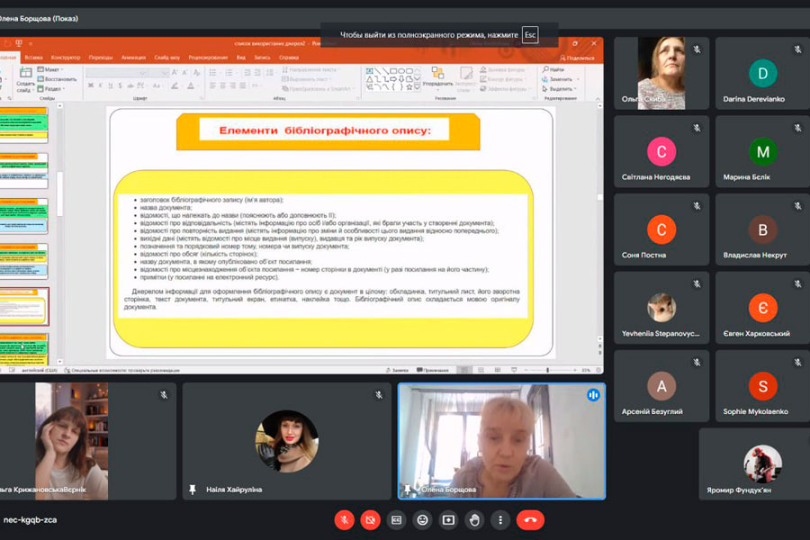 Олена Борщова поділилася власним досвідом, презентувала невеличку «бібліошпаргалку», яка допоможе здобувачам освіти та науковцям вірно оформляти статті, курсові та магістерські роботи. Спікерка зазначила, що бібліографічна грамотність демонструє досвідченість дослідника.