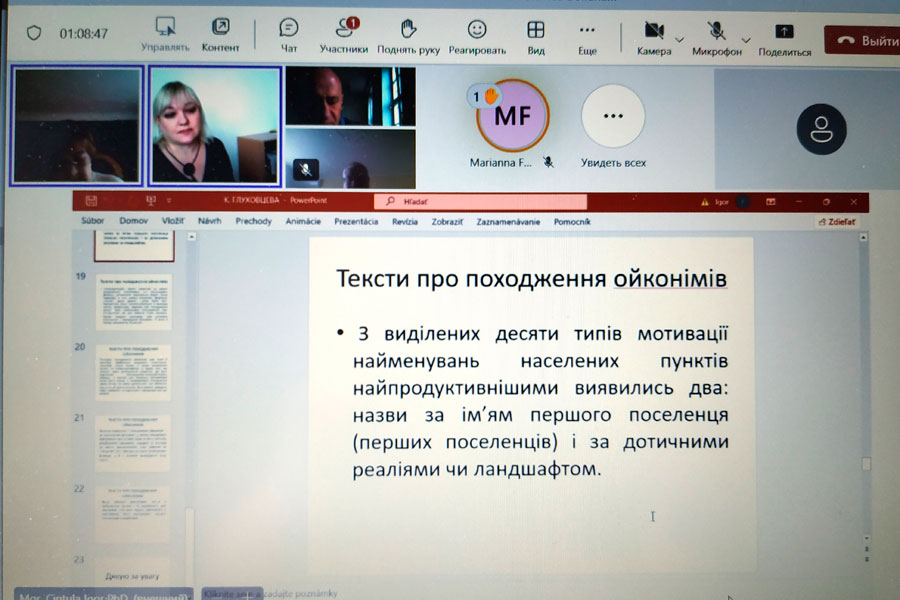 Викликала зацікавлення праця «Ойконім як текстотворчий чинник діалектного тексту» професорок кафедри української мови Катерини Глуховцевої та Алли Нікітіної (Poltava), які проаналізували структуру та семантику текстів про походження ойконімів, записаних на території слобожанських говірок української мови, тобто на Луганщині, історично Східній Слобожанщині, а отже, того мовного простору, що нині трансформується. Було підкреслено, що ці тексти наразі слід розглядати як культурні й мовні пам’ятки.