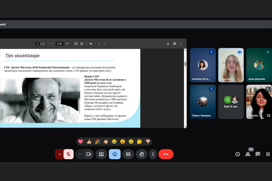 Темою заходу стала «Соціальний педагог. Професійні навички – твоя сила». Учасники мали змогу поспілкуватися з фахівцем-практиком – Єфіменко Анастасією, соціальним педагогом Київського обласного відділення Міжнародної благодійної організації «СОС Дитяче містечко».