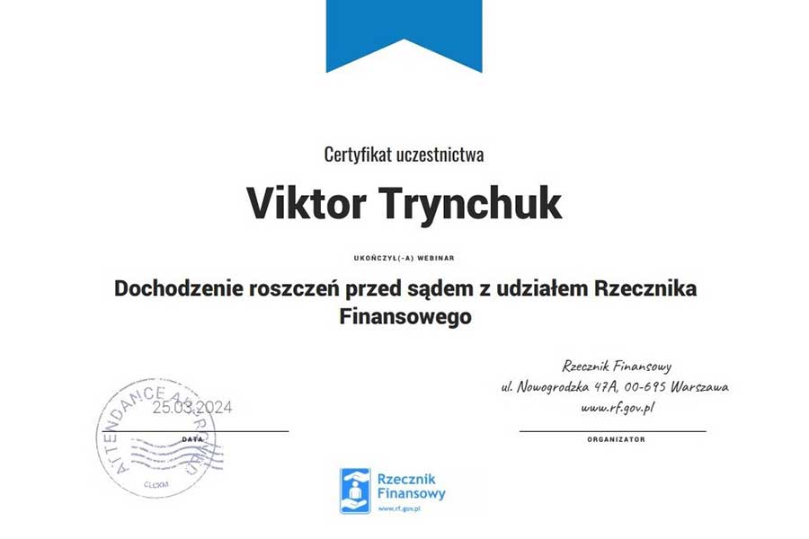 Завдячуючи наявним багаторічним дружнім стосункам з представниками Офісу Фінансового омбудсмена Польщі, професори кафедри фінансів, обліку та банківської справи Віктор Тринчук та Юрій Клапків здійснювали візит до офісу Фінансового омбудсмена у Варшаві, організовували спільну конференцію у Кракові, розробили для здобувачів освіти третього рівня дисципліну «Захист прав споживачів на ринку фінансових послуг», мають змогу постійно долучатися до вебінарів з питань захисту прав споживачів на ринку фінансових послуг.