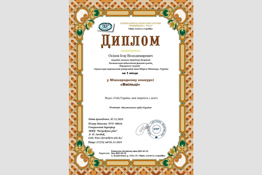 Вітаємо Осіпова Ігора Володимировича із заслуженим визнанням на Міжнародному рівні! Втілення всіх творчих та креативних задумів у реальність!