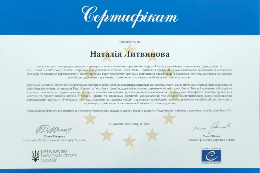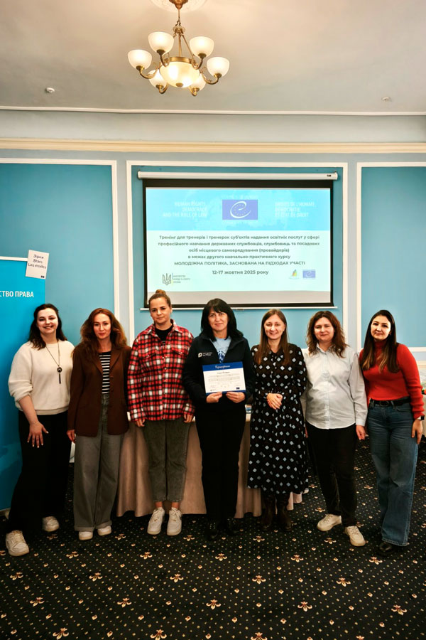 З 12 по 17 жовтня 2025 року у м. Львів, який цього року має почесне звання Європейської молодіжної столиці, відбулося навчання другої групи тренерів і тренерок у межах навчально-практичного курсу «Молодіжна політика, заснована на підходах участі», що реалізується Проєктом Ради Європи «Молодь за демократію в Україні: Фаза IV» спільно з Міністерством молоді та спорту України.