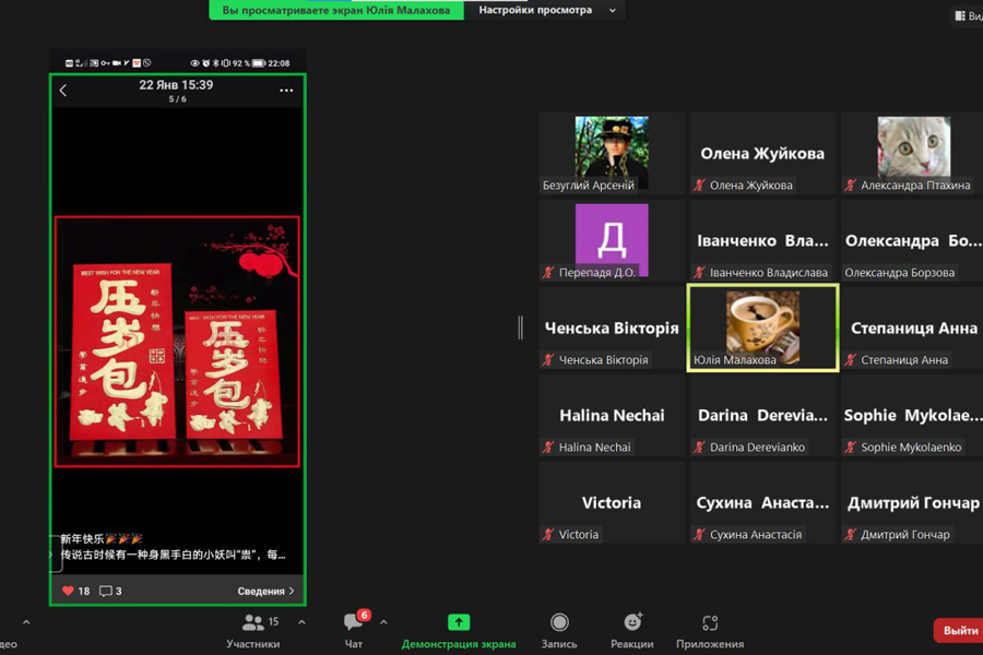 Малахова Юлія Володимирівна ознайомила присутніх з особливостями святкування Нового року у Китаї, розказала про життя у Китаї в період святкування, подарунки та новорічний декор. Традиційні новорічні феєрверки у КНР пов’язані із особливою легендою про чудовисько Нянь.