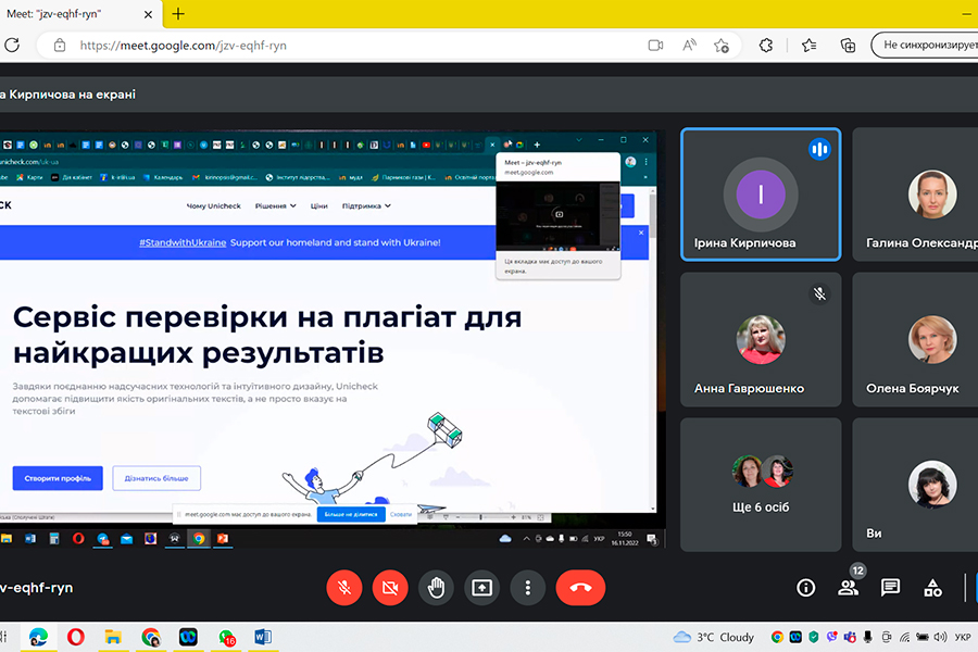 16 листопаду 2022 р. науково-педагогічні працівники та аспіранти кафедр факультету природничих наук прийняли участь у роботі семінару «Внутрішня політика і процедури забезпечення академічної доброчесності, підходи зовнішньої оцінки їх якості». Спікером та модератором зустрічі була Ірина Кирпичова, доцент кафедри садово-паркового господарства та екології, кандидат біологічних наук. Під час семінару було розглянуто питання вимог до нормативного забезпечення академічної доброчесності у вищій освіті, критерії оцінювання академічної доброчесності під час акредитації освітніх програм та продемонстровано практичний кейс роботи за допомогою інформаційної онлайн системи виявлення текстових збігів unicheck.