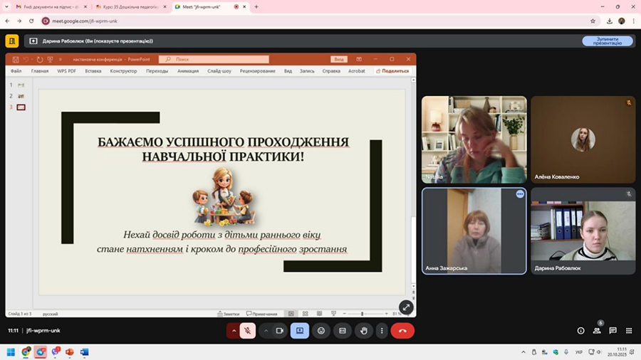 Зустріч проходила в онлайн-форматі, що дало змогу всім учасникам зручно приєднатися до обговорення організаційних питань. Керівник практики від кафедри, Зажарська Г. П., надала детальну інформацію щодо термінів, мети, змісту та завдань проходження практики. Здобувачів також ознайомили з особливостями її організації в групах раннього віку, вимогами до оформлення звітної документації та системою оцінювання результатів.