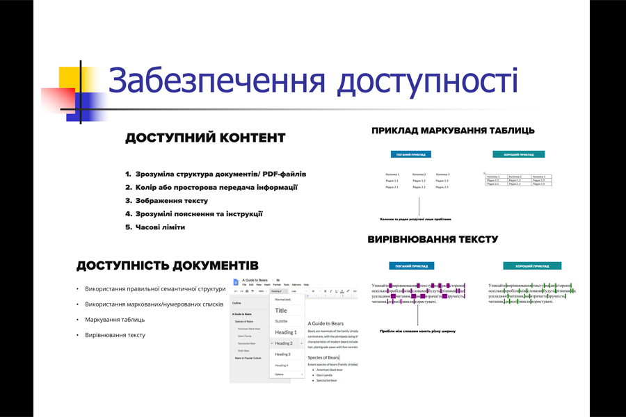 Доповідачем уточнено основні поняття, принципи навчання дорослих, основні задачі Національної стратегії розвитку інклюзивної освіти на 2020-2030 роки, сучасні методи забезпечення доступності освіти щодо людей з особливими потребами. Так «інклюзивне освітнє середовище» розглядалося як сукупність умов, способів і засобів їх реалізації для спільного навчання, виховання та розвитку здобувачів освіти з урахуванням їхніх потреб та можливостей. У семінарі наводяться приклади застосування універсального дизайну для підготовки презентацій для осіб з особливими потребами, основні умови забезпечення доступності відповідно до WAI, який формулює технічні умови, правила, методи та допоміжні ресурси, що описують рішення щодо забезпечення веб-доступності веб-контенту (WCAG) 2.0, який одночасно є стандартом міжнародної системи якості ISO: ISO/IEC 40500.