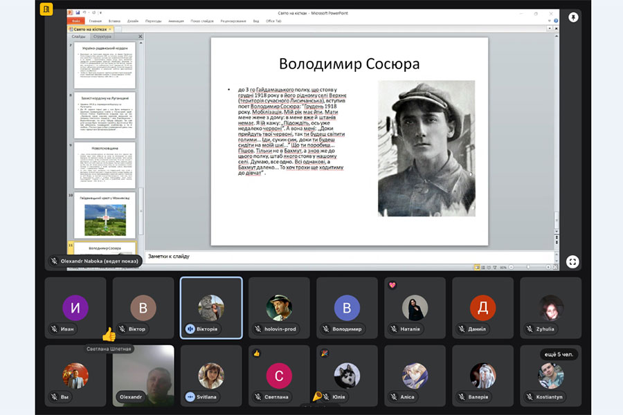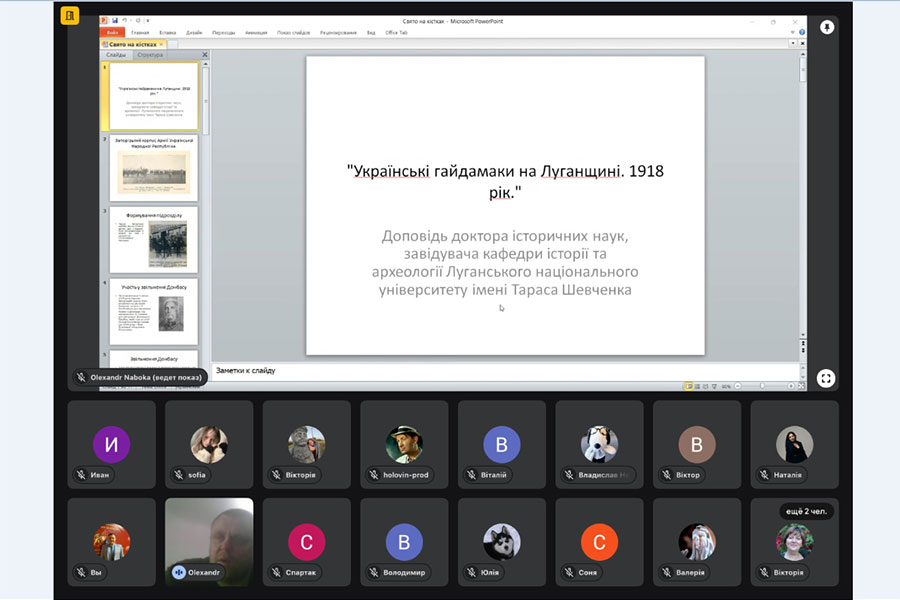 У Луганському національному університеті імені Тараса Шевченка відбулася науково-популярна доповідь доктора історичних наук, завідувача кафедри історії та археології Олександра Набоки присвячена маловідомим сторінкам подій національно-визвольної революції 1917 – 1921 рр., на теренах Луганщини. У центрі уваги доповідача – діяльність українських гайдамацьких загонів (підрозділів Запорізького корпусу армії УНР), які в умовах становлення Української Народної Республіки та загострення військово-політичної ситуації на Сході України відіграли важливу роль у захисті державності у регіоні.