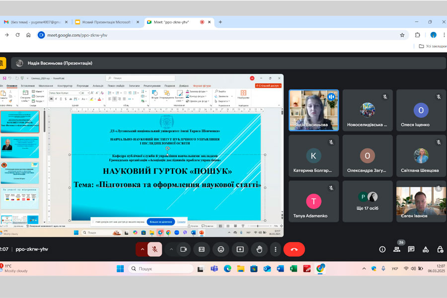Засідання наукового гуртка було присвячено актуальній темі «Оприлюднення наукових здобутків і підготовка наукових статей/тез». У засіданні взяли участь здобувачі освіти ІІ (магістерського) рівня вищої освіти спеціальностей 281 «Публічне управління та адміністрування» і 073 «Менеджмент», а також науково-педагогічні працівники кафедри.
