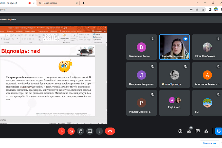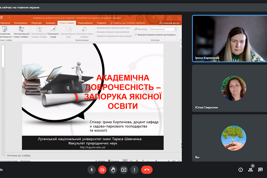 Спікером та організатором виступила Ірина Кирпичова, доцент кафедри садово-паркового господарства та екології. Зустріч присвячена питанням академічної культури, яка заснована на принципах чесності, реального навчання, справедливості, довіри та взаємоповаги усіх учасників академічного процесу, здатна сформувати суспільство, спроможне долати кризи і успішно розвиватися. Адже академічна доброчесність сприяє дієвості системи освіти, що надає справжні знання та навички, а не лише документи про здобуття освіти.