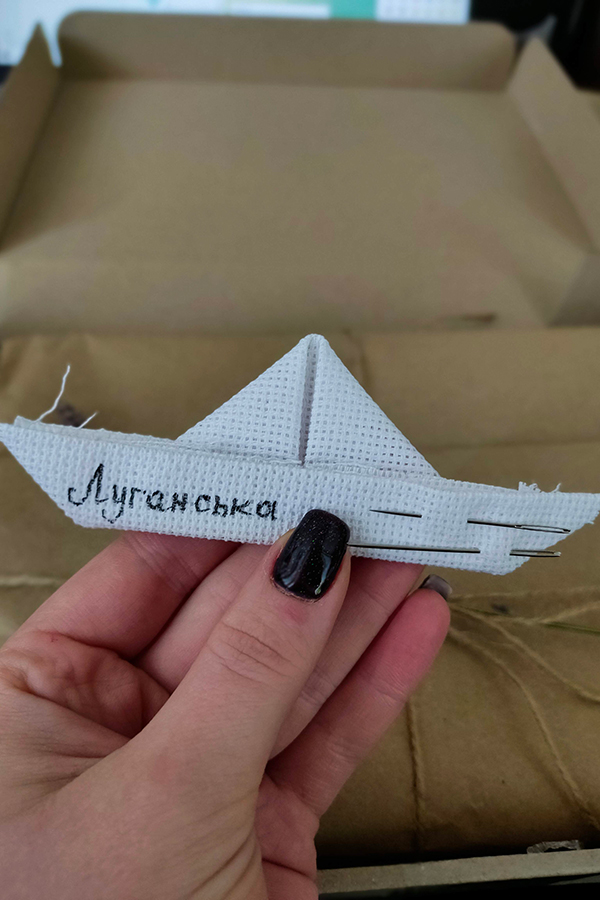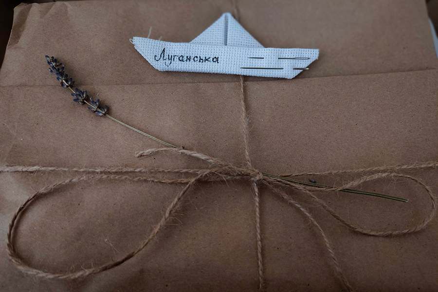 Майстриня із Державного закладу «Луганський національний університет імені Тараса Шевченка» вишиває свою область в евакуації, в місті Полтава, куди у лютому 2022 року тимчасово евакуювався університет. Працюючи далеко від рідного дому, наші НПП не забувають рідну землю і мріють вже в найближчий час повернутися додому.