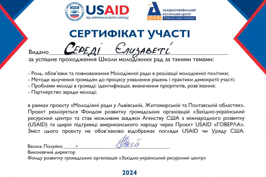 Захід об’єднав прогресивну молодь Миргородської громади. Активну участь у навчальному семінарі взяла і студентка першого курсу спеціальності «Науки про Землю» Навчально-наукового інституту природничих і аграрних наук ДЗ «Луганський національний університет імені Тараса Шевченка» - Єлизавета СЕРЕДА.