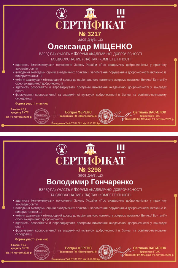 Учасники отримали сертифікати, що підтверджують їхню обізнаність у питаннях академічної доброчесності, етики в освіті, критичного мислення, інформаційної грамотності та відповідального використання технологій.