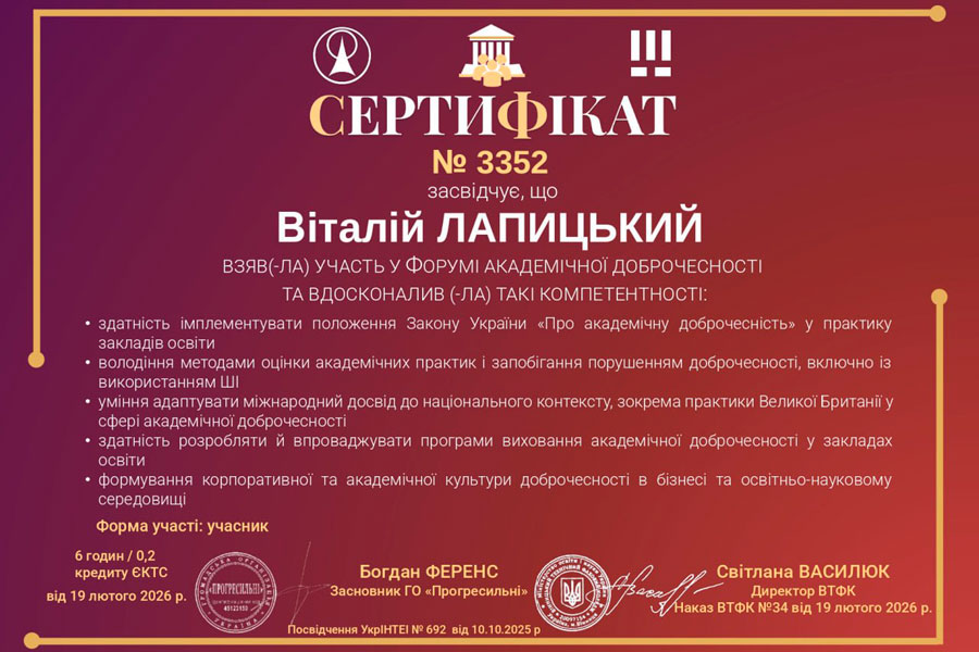 здатність розробляти й впроваджувати програми виховання академічної доброчесності у закладах освіти 6 годин / 0,2 кредиту ЄКТС від 19 лютого 2026 р.
