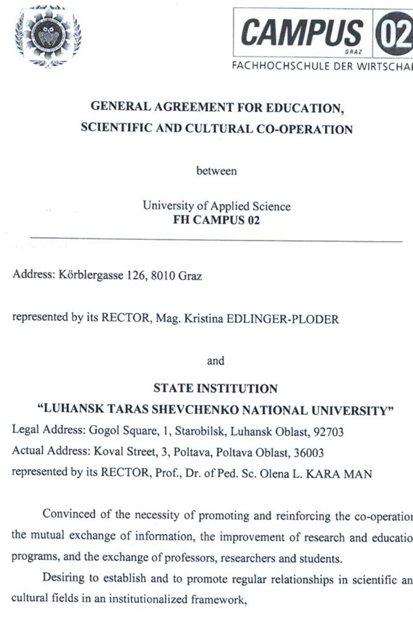 Угода підисана 08.05.2033 ректором ДЗ «Луганського національного університету імені Тараса Шевченка», професором Оленою Караман. Австрійський університет уже в цьому році виступає співорганізатором I Міжнародної науково-практичної конференціі «Інтерграція науки та практики управління в умовах соціокультурних трансформацій», яка відбудеться на базі кафедри публічної служби та управління навчальними й соціальними закладами Луганського національного університету імені Тараса Шевченка 25 травня 2023 р. Сподіваємося на подальшу плідну співпрацю в освітній та науковій сферах.