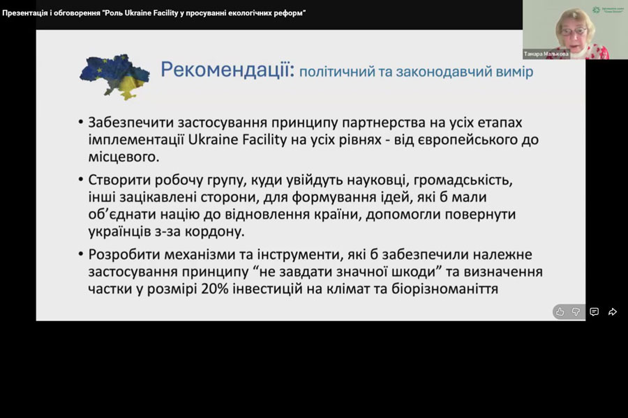24 жовтня 2025 року представники Навчально-наукового інституту природничих і аграрних наук ДЗ «Луганський національний університет імені Тараса Шевченка» взяли активну участь в онлайн-заході «Роль Ukraine Facility у просуванні екологічних реформ», який організований РАЦ “Суспільство і довкілля”. Під час зустрічі було проаналізовано наявність «зеленої» складової в Ukraine Facility та Плані України, а також обговорено практичні аспекти впровадження екологічних реформ відповідно до положень Плану.