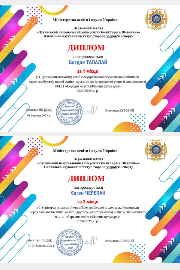 Журі у складі голови – завідувачки кафедри теорії та методики фізичного виховання Олени Отравенко, директора ННІОЗіС Олександра Дубового, доцентів кафедри теорії та методики фізичного виховання Олександра Ливацького, Олени Соколенко, Марини Карпенко, кращого студента ЛНУ-2024 року, випускника другого (магістерського) рівня спеціальності 014 Середня освіта (Фізична культура) Кирила Іванова визначило переможців: серед здобувачів вищої освіти першого (бакалаврського) рівня: І місце – Єлизавета КОТРІКОВА, науковий керівник О.В. Отравенко; ІІ місце – Катерина КРИВЕЦЬ, науковий керівник О.В. Отравенко; ІІІ місце – Іван ТУЗОВ, науковий керівник О.В. Ливацький. На другому (магістерському) рівні місця розподілились наступним чином: І місце – Богдан ТАЛАЛАЙ, науковий керівник О.В. Отравенко; ІІ місце – Сніжана ДІЖЕВСЬКА, науковий керівник О.В. Отравенко; ІІІ місце – Євген ЧЕРЕПАН, науковий керівник М.І. Карпенко. Майже всі здобувачі вищої освіти є членами наукового гуртка «Молодий науковець» кафедри теорії та методики фізичного виховання.