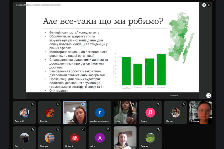 Захід проводився для здобувачів освіти спеціальностей "Соціологія" та "Політологія" з метою розширення знань і навичок у сфері аналізу соціальних процесів та політичних динамік. Лектором заходу виступила визнана соціолог та аналітик Людмила Проценко, яка працює у відділі регіонального розвитку у компанії "Region Kalmar län", Швеція. Її досвід у цій сфері був корисний учасникам не лише з точки зору теоретичного огляду, але й з практики застосування навичок використання інструментів аналізу та візуалізації даних. Пані Людмила розповіла про свій досвід роботи у Швеції, про свій відділ: його функції, напрямки роботи та специфіку організації роботи. Експертка зупинилась на декількох інструментах аналізу даних, розповіла, яким чином вони допомагають аналітику в роботі, продемонструвала інтерактивні карти, діаграми, таблиці. Вона надала інструкцію роботи з програмами "The R Project for Statistical Computing"," ArcGIS", "Power BI" та ін.