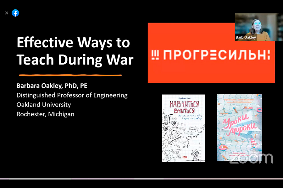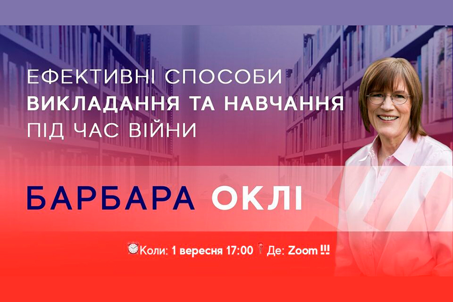 Війна вносить свої корективи в усі сфери життєдіяльності, зокрема і в освітній процес. Так, команда «Прогресильні» спільно із Школою IT професіоналів «ProfIT» організували онлайн-тренінг «Ефективні способи викладання та навчання під час війни», участь в якому взяли викладачі нашого університету. Провела лекцію Барбара Оклі – професорка інженерії Оклендського університету, дослідниця, письменниця, авторка найпопулярнішого курсу на Coursera.