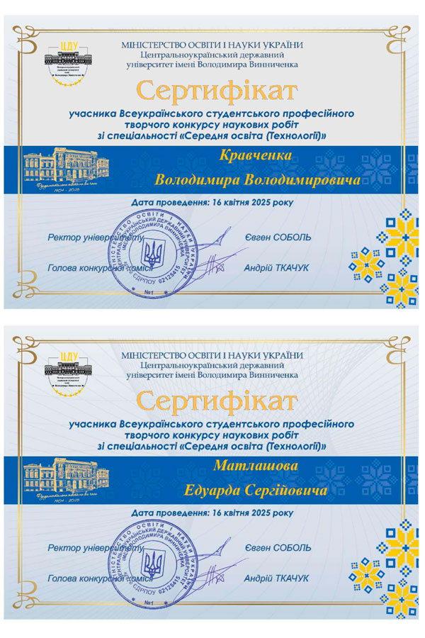 Цьогоріч на базі Центральноукраїнського державного університету імені Володимира Винниченка (м. Кропивницький) проводився Всеукраїнський студентський професійний творчий конкурс наукових робіт зі спеціальності «Середня освіта (Технології)» серед студентів закладів вищої освіти України.