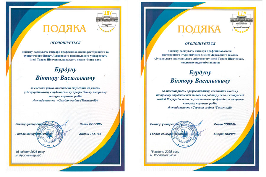 Кафедра професійної освіти, ресторанного і туристичного бізнесу ДЗ «ЛНУ і мені Тараса Шевченка» вітає своїх студентів і їх керівників з гідним виступом на конкурсі. Особливо вітаємо Кравченко Володимира, його наукового керівника Бурдуна Віктора Васильовича з перемогою у конкурсі! Бажаємо подальших успіхів в науковій роботі!