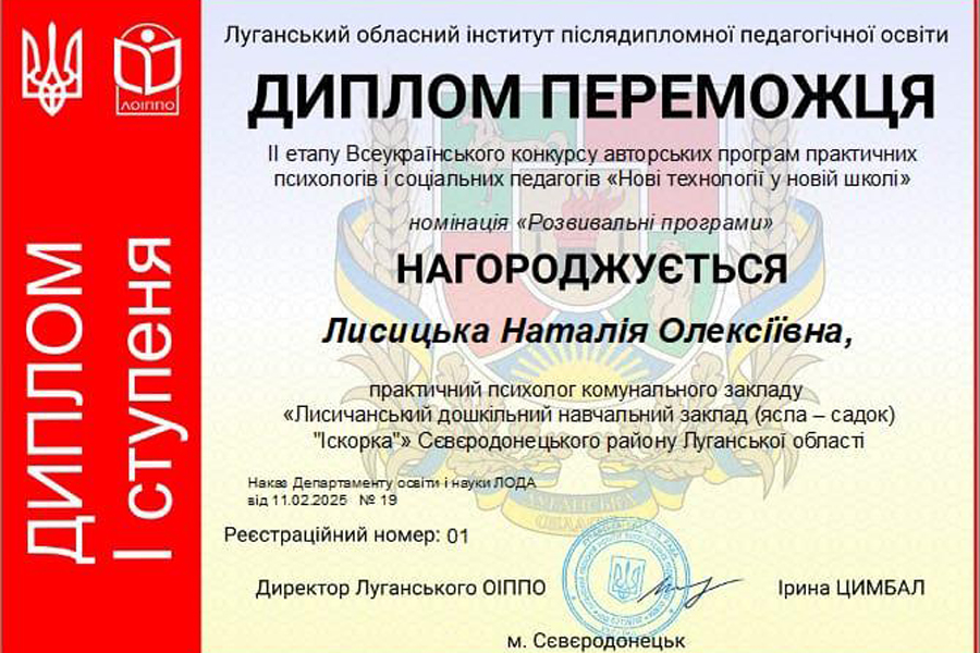 Приємно відзначити, що диплом переможця конкурсу у номінації «Розвивальні програми» отримала здобувачка першого року навчання другого (магістерського) рівня вищої освіти спеціальності 231 «Соціальна робота» за освітньою програмою «Соціальна робота. Соціальна педагогіка. Практична психологія» Наталія ЛИСИЦЬКА.