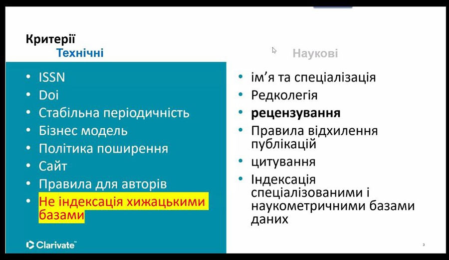 Під час вебінару розглядали питання про критерії якості наукових видань, критерії при виборі видання для публікації власних досліджень, як не стати жертвою хижацького видання та інші корисні практики стосовно публікаційного процесу.