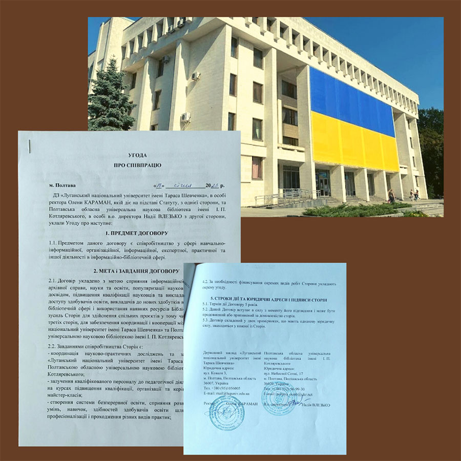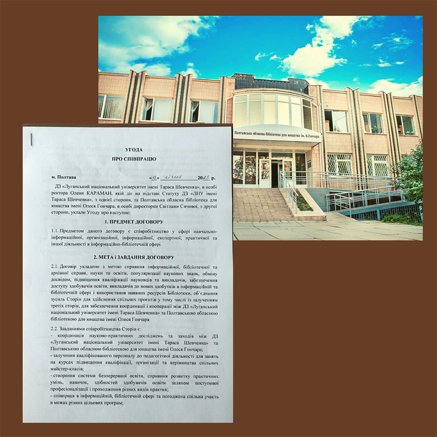 18 січня 2023 року підписана угода з Полтавською обласною бібліотекою для юнацтва імені Олеся Гончарата Полтавською обласною універсальною науковою бібліотекою імені І.П. Котляревського для співпраці у сфері навчально-інформаційної, організаційної, інформаційної, експертної, практичної та іншої діяльності в інформаційно-бібліотечній сфері.