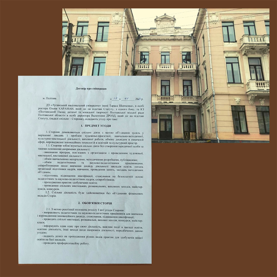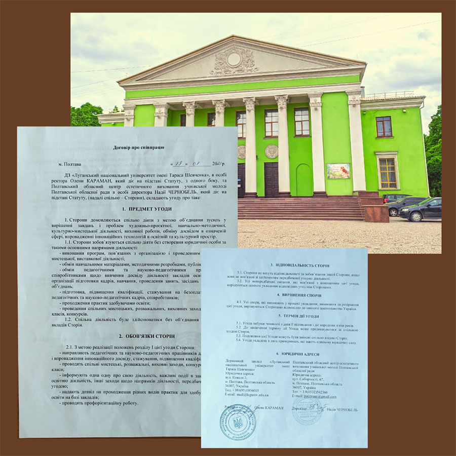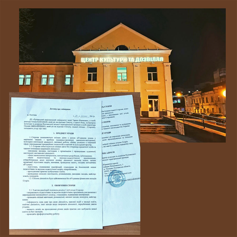 17 січня 2023 року підписаний договір про співпрацю між ЛНУ імені Тараса Шевченка та Центром культури та дозвілля Полтавської міської територіальної громади та КЗ «Полтавський Палац дитячої та юнацької творчості Полтавської міської ради Полтавської області», а 19 січня – із Полтавським обласним центром естетичного виховання учнівської молоді Полтавської обласної ради. Сторони домовилися спільно діяти з метою об’єднання зусиль у вирішенні завдань і проблем художньо-проєктної, навчально-методичної, культурно-мистецької діяльності, виховної роботи, обміну досвідом в означеній сфері, впровадженні інноваційних технологій і освітній та культурний простір.