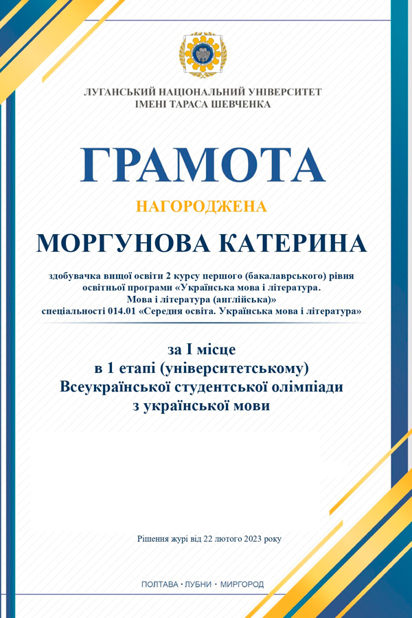 І місце – Моргунова Катерина, ОП «Українська мова і література. Мова і література (англійська)»