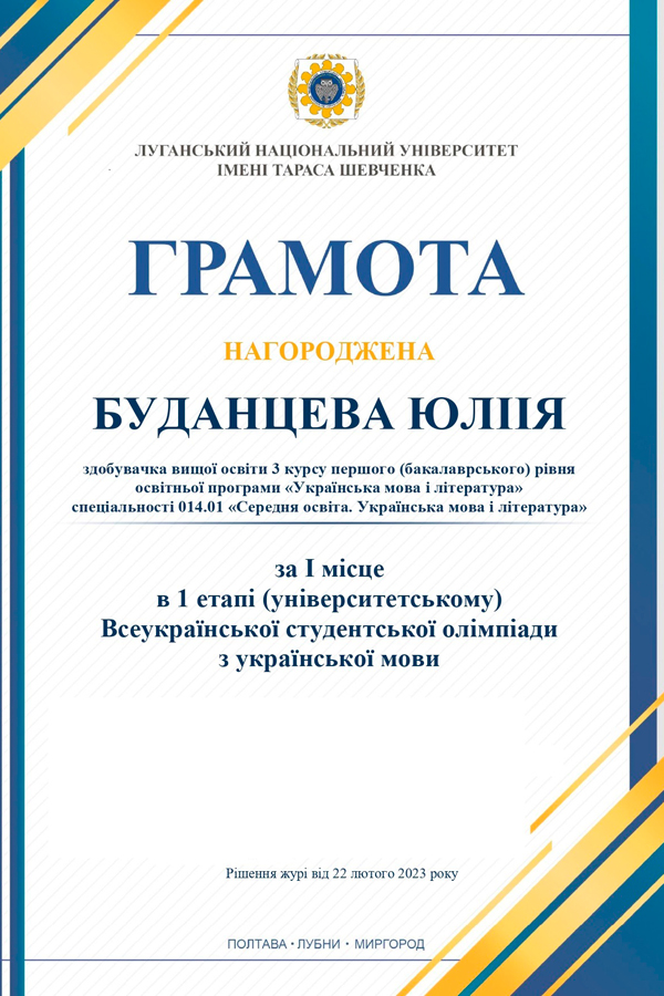 І місце – Буданцева Юлія, ОП «Українська мова і література»