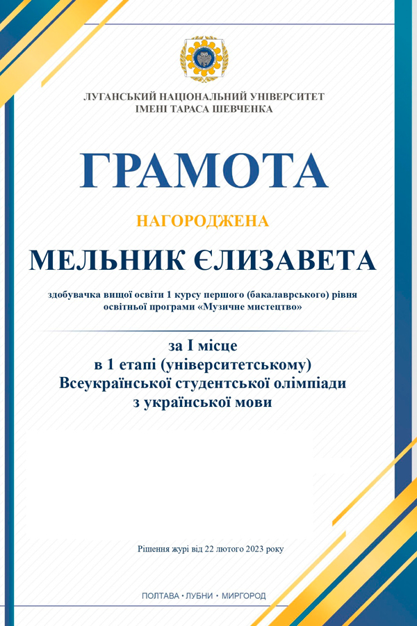 І місце – Мельник Єлизавета, ОП «Музичне мистецтво».